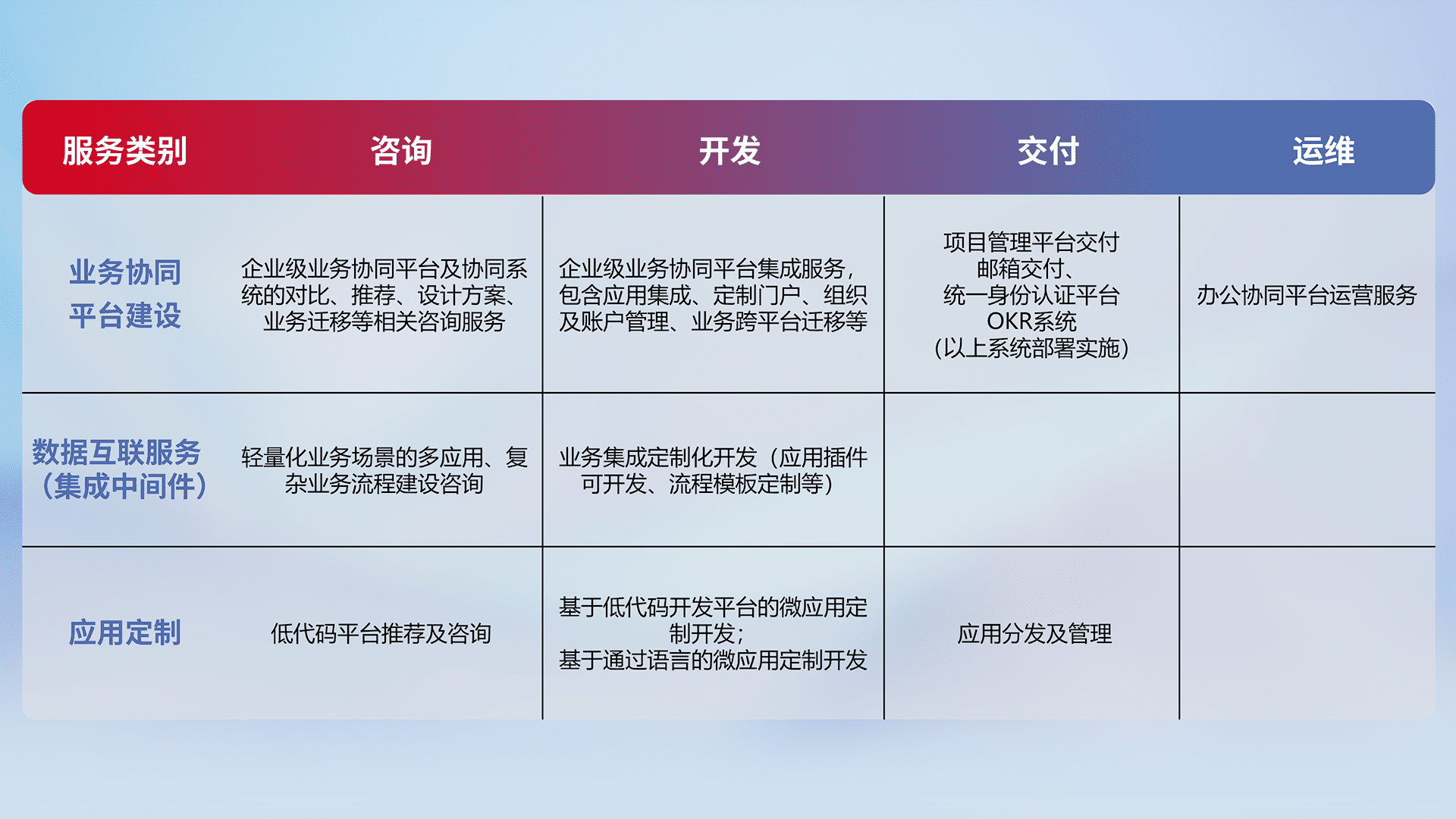 针对钉钉、、、企微、、、、IDaas等平台级产品提供产品的规划、、方案、、、、交付、、、、定制化开发等服务,,,实现如统一协同办公、、智能客户服务、、、、混合会议管理、、、智能数据查询、、、、等业务场景,,实现数字化转型。。